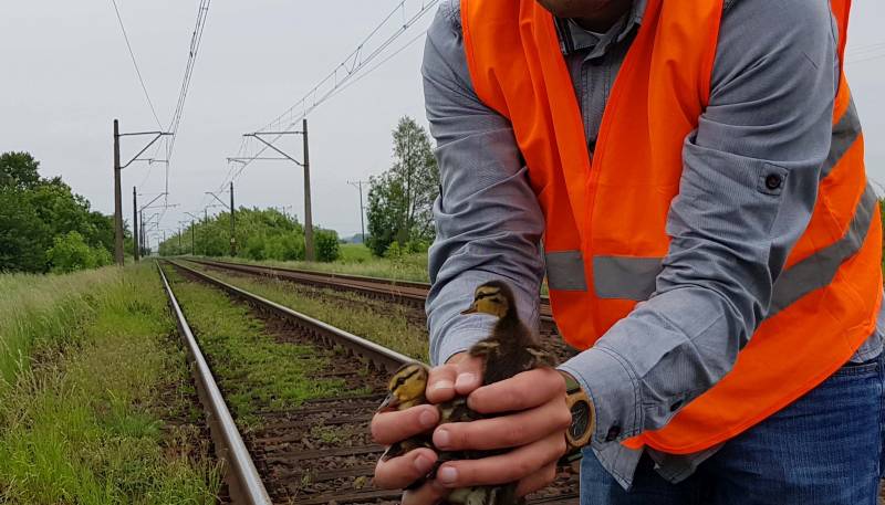 Podczas realizowanych przez Nas nadzorów przyrodniczych nad wszelkiego rodzaju budowami szczególną uwagę poświęcamy na ochronę części biotycznej środowiska. Bardzo często, a w szczególności w okresie migracji płazów, dokonujemy ich ewakuacji poza teren budowy. Ważne jest, aby zwierzęta przenieść w odpowiednie dla nich siedlisko. Tym razem podczas rutynowej kontroli na modernizowanej linii kolejowej dostrzegliśmy stadko małych kaczek krzyżówek uwięzionych pomiędzy szynami. Działać trzeba było szybko. Co prawda ptaki znajdowały się na wyłączonym z ruchu torze niemniej jednak stres związany z przejeżdżającymi tuż obok pociągami był pewnie dla nich ogromny. Sprawna akcja i po kilku minutach rodzeństwo zostało wypuszczone w bezpieczne miejsce znajdujące się poza terenem budowy.